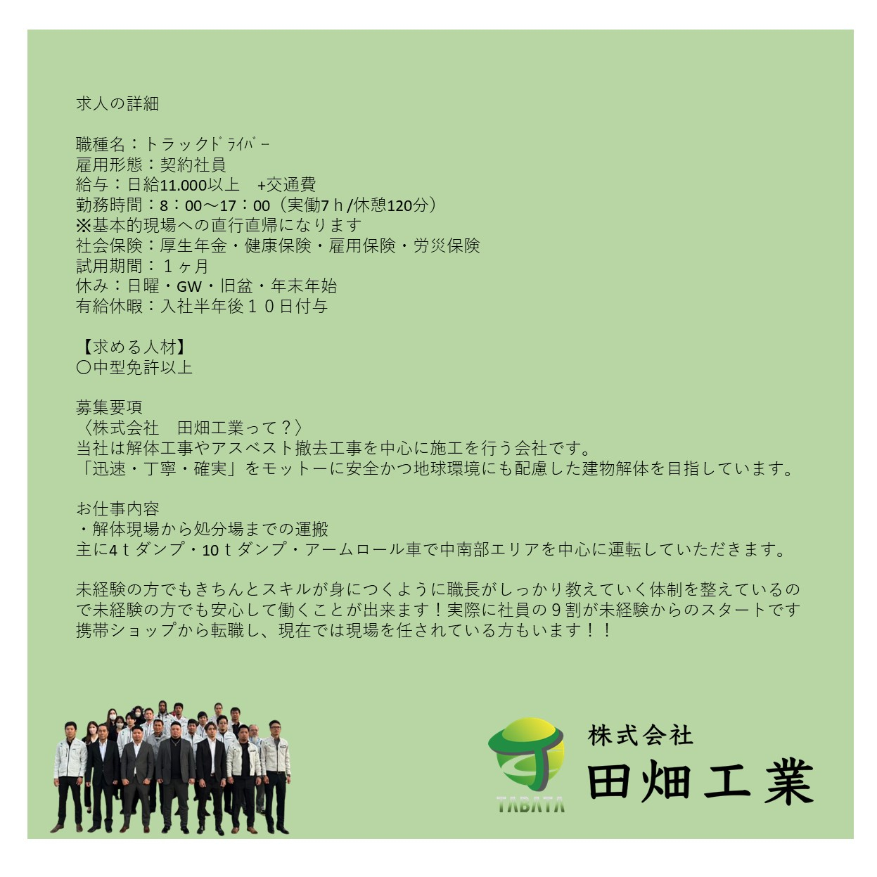 作業員・トラックドライバー募集中です! 2025/01/22 株式会社 田畑工業では一緒に働く仲間を募集しています 社員の9割が未経験からのスタートで現在活躍されています♪ 興味がある方はお話だけでもいいので気軽にお電話ください✨ 一緒に解体工事から未来を創りましょう✨ お知らせ